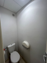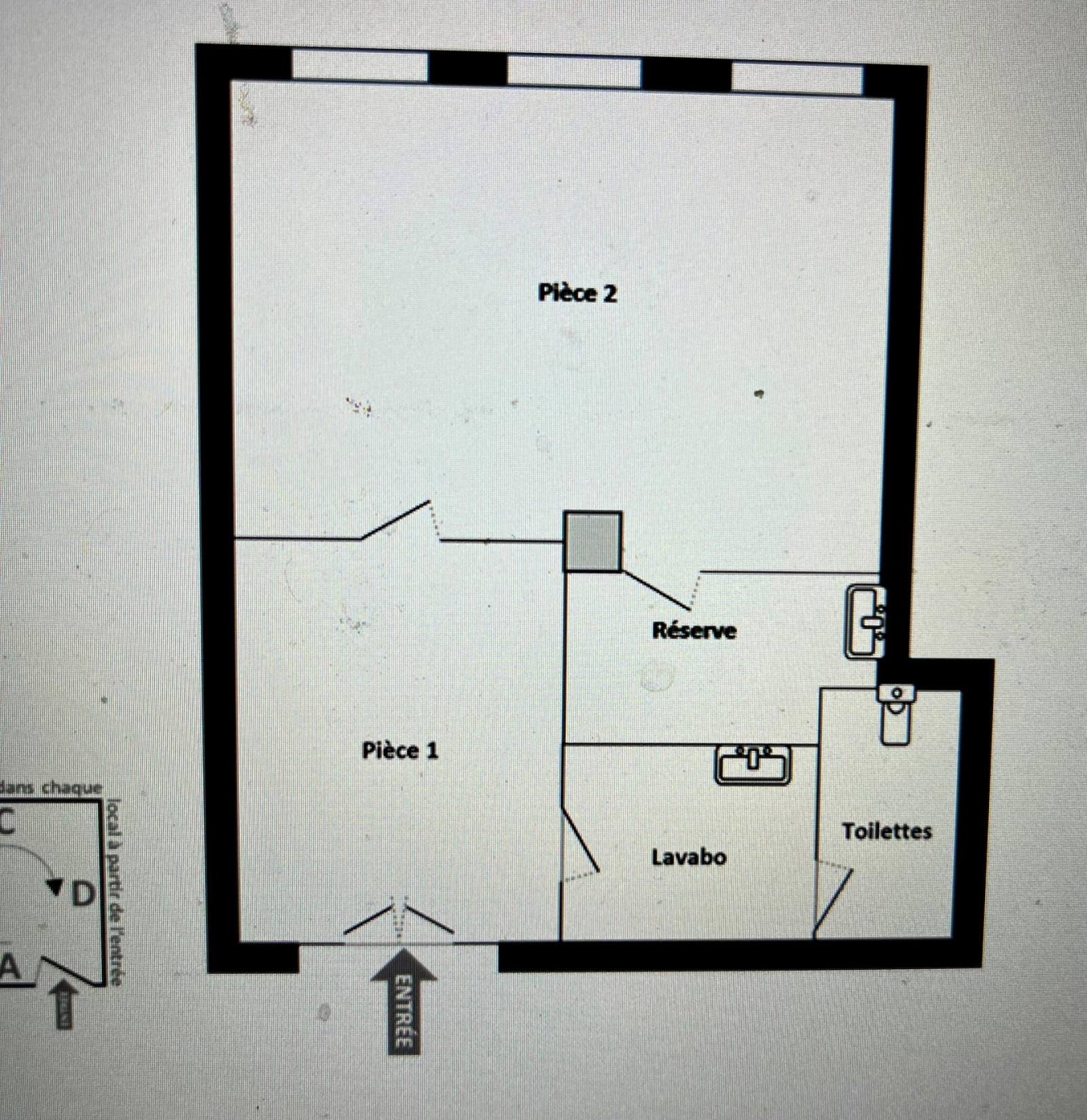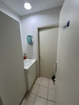 Salle d'attente de 7.29 m², qui donne sur un espace lavabo (1.85m²) et wc (1.41m²)