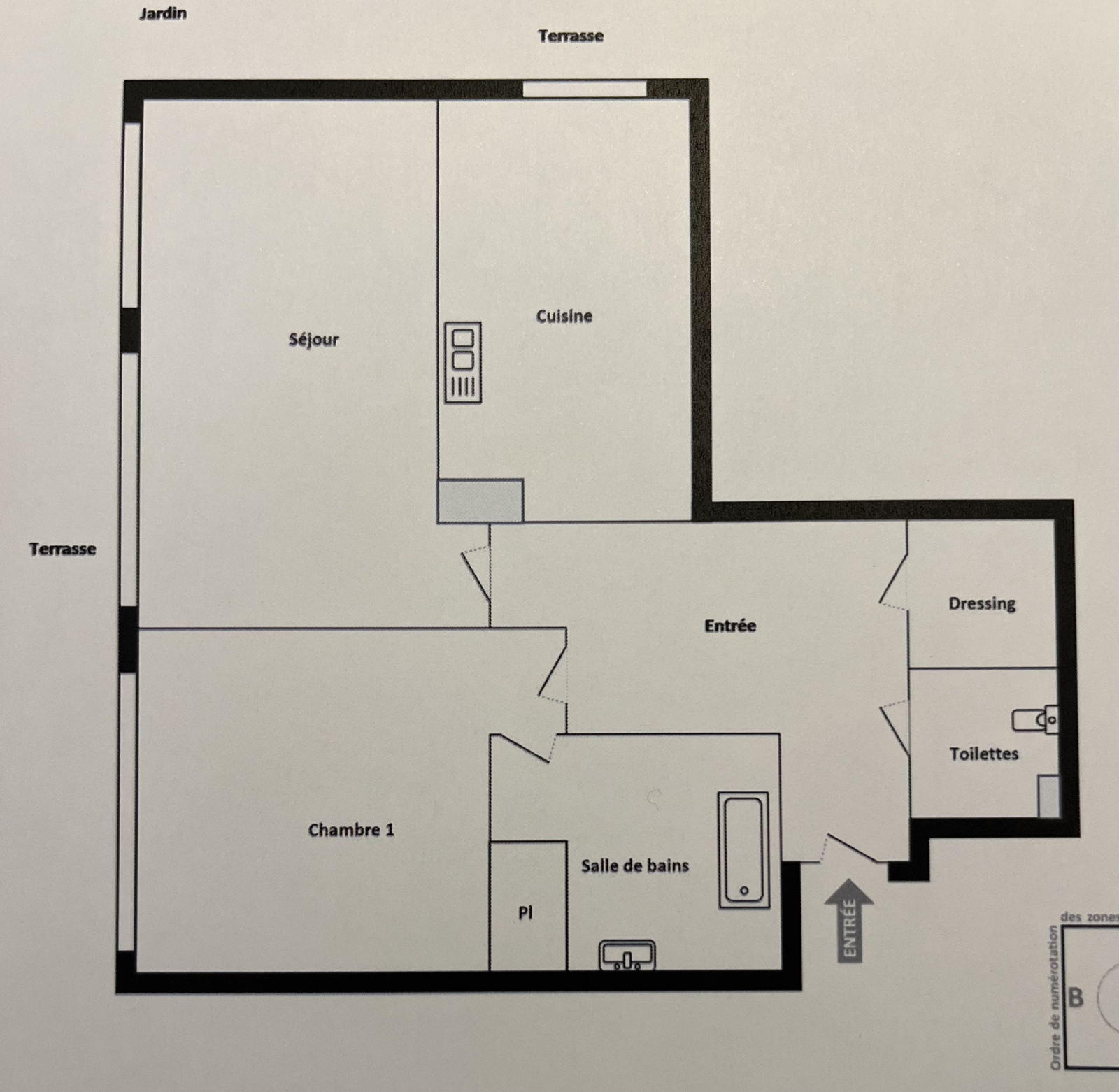 Beau séjour 20 m² très lumineux avec des baies vitrées sur toute la longueur, donnant sur la plus grande des deux terrasses. Belle chambre de 13m² avec un grand placard intégré. Cuisine de 9m², large, indépendante et équipée avec accès à la deuxième terrasse.